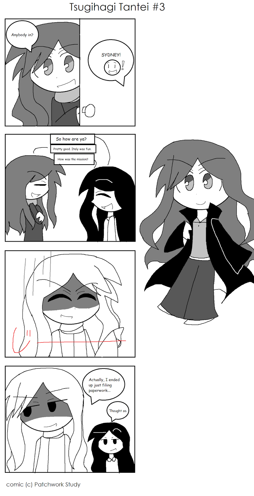 #4: As school starts again and I get a new sketchbook I might post an actual doujin on here that retells a mystery for the gang. It'll be slightly darker and less set on humor because it is a crime mystery and stuff, but if I either find out how to scan things or I actually find efficient software to make a real manga comic. I'll try my best!